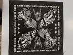 Show off your love for WSOU with this bold, edgy bandana! Featuring a striking black background and white artwork, this design celebrates the spirit of rock and metal with iconic elements: